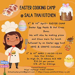 Dates: Thursday 9th or Friday 10th April 2026 Children will learn to make and decorate: - Easter Egg Nests - Hot Cross Buns - Pizza - Chow Mein Noodles They’ll take home a box of their own creations to share (if they don’t eat them first!) Suggested age: 4 – 12 years Session Times: 9.30am drop off, pick up by 3pm Venue: Sala Thai Kitchen, 5A High St, St Albans, AL3 4ED Price: £52.50 per child. Includes all ingredients, use of equipment, apron, drink, snacks & lunch Limited spaces – booking essential!
